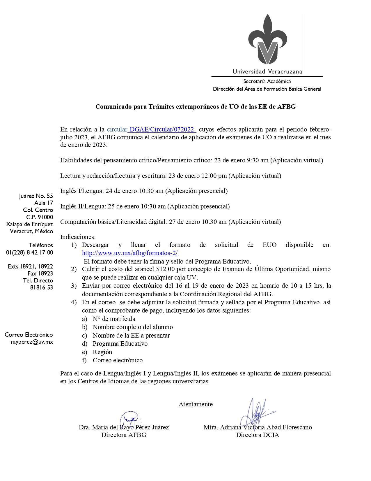 Atención alumno: si no acreditaste en 2ª inscripción alguna de las EE del AFBG en los periodos 202251 (febrero-julio 22) o 202288 (intersemestral de verano) y aún no presentas tu examen de Última Oportunidad, debes atender el siguiente comunicado: