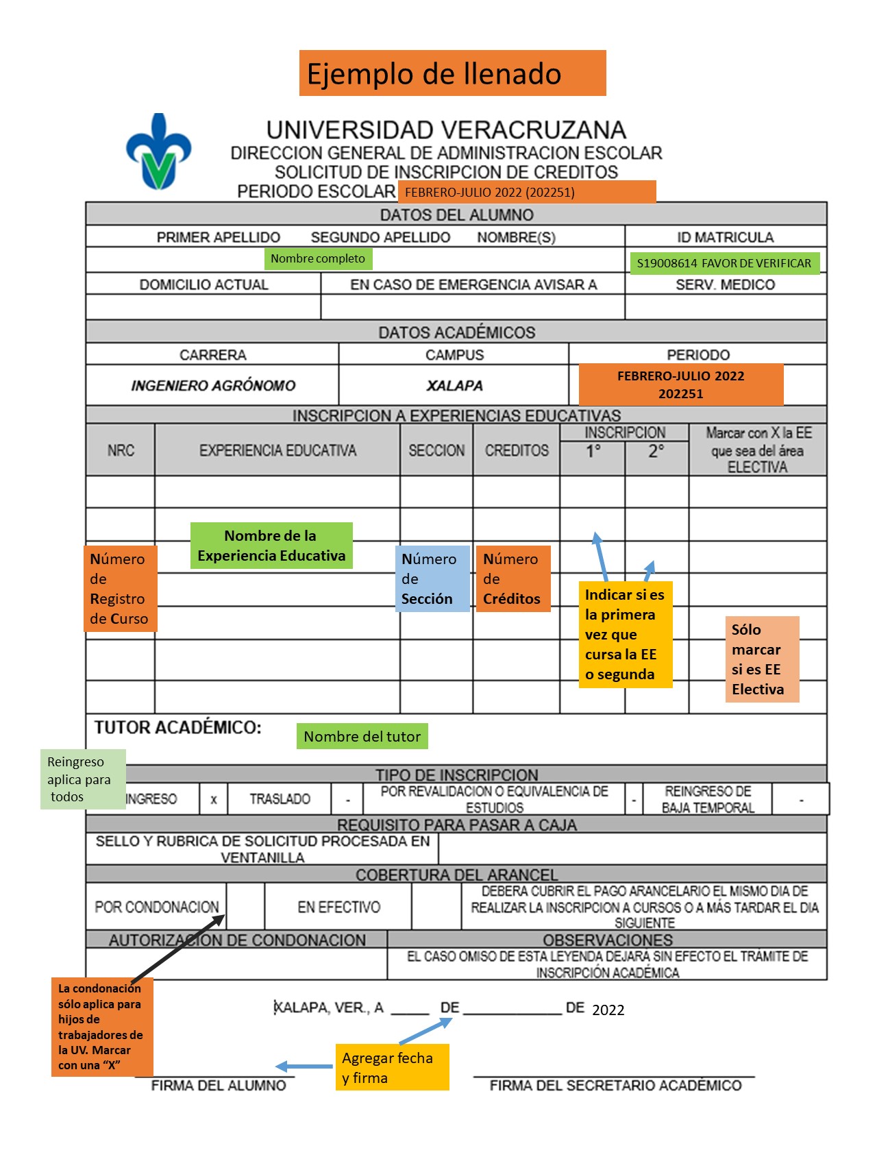 En la pagina web de la facultad www.uv.mx/agronomia en la sección de estudiantes podrás descargar el formato de Inscripción (FormatoCréditos Febrero-Julio 2022 202251) correspondiente al periodo escolar actual, donde pondrás los NRC y nombre de las Experiencias Educativas que registraste en sistema, de ser posible debes firmes de manera digital, revisar que los datos estén de manera correcta, este archivo lo podrás enviar en formato Word o pdf.
