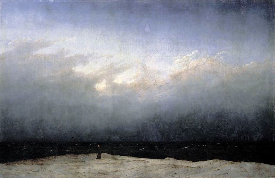 La monja y el marAutor: Caspar David Friedrich Se refleja lo ominoso del cielo tormentoso y amenazante. Además, poco a poco, el autor representó el abismo del mar frente a una monja en el borde de la arena. Los tonos azules que representan a las nubes ofrecen un consuelo ante tal panorama. |