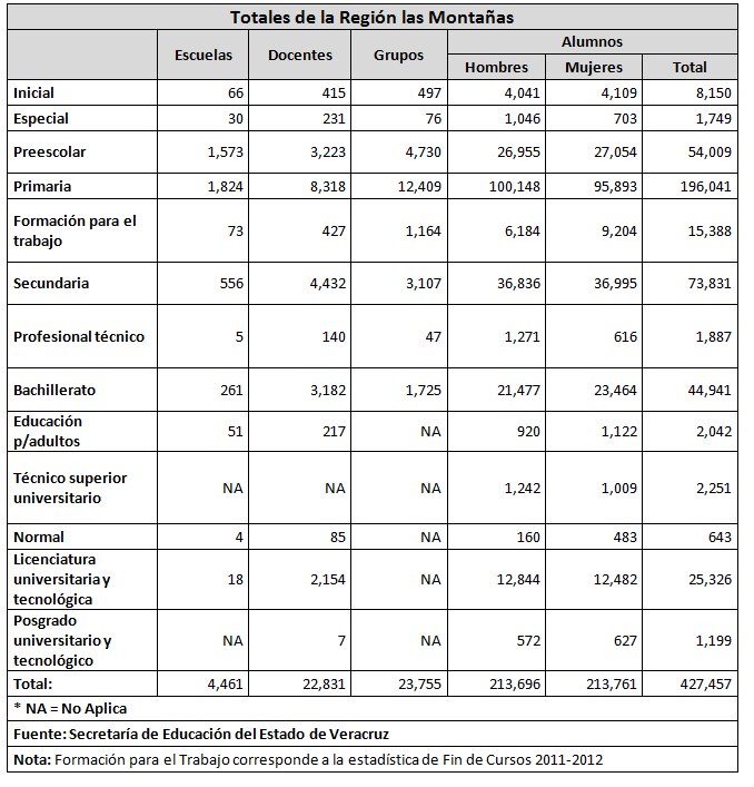 En el tema de educación, la región Córdoba-Orizaba contó para el periodo 2011-2012 con 4,461 escuelas entre las que destacan las primaria, así mismo presenta la mayor parte de los docentes (8,318) siendo el 36% aproximadamente respecto al total regional.