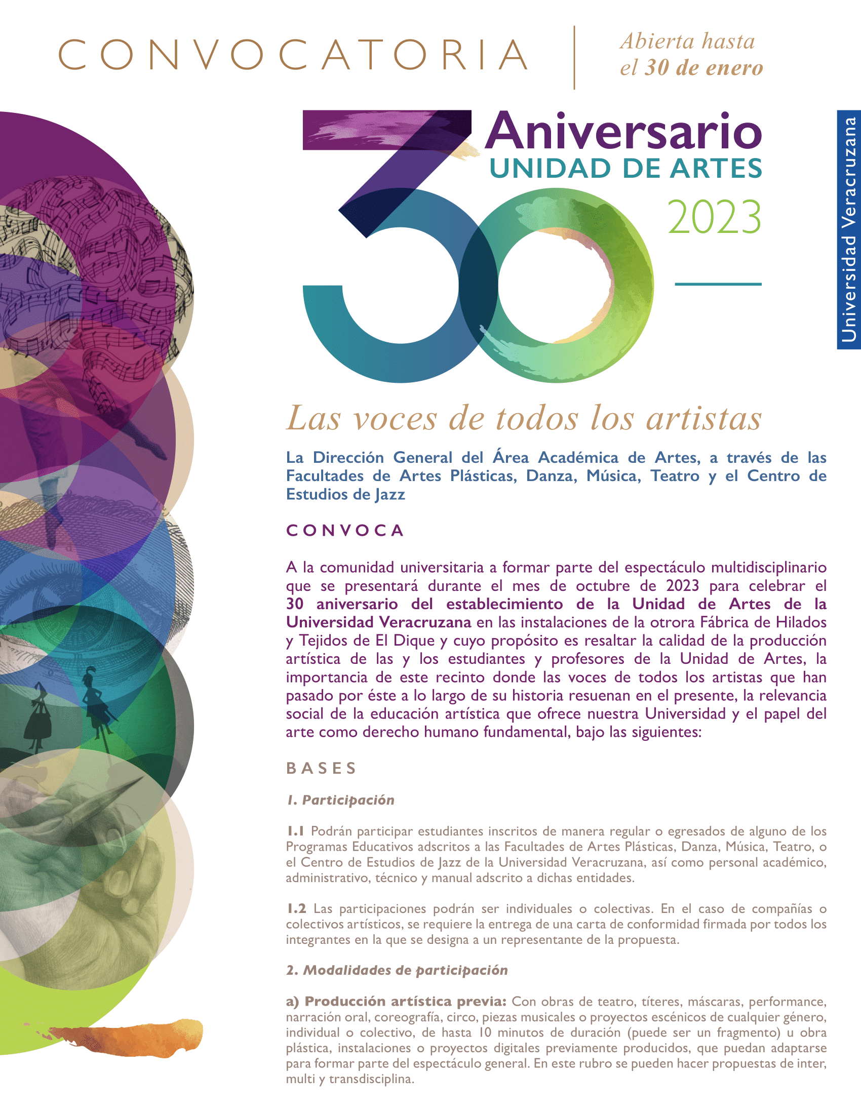 | Convocatoria 30 Aniversario Unidad de Artes | Hasta el 30 de enero de 2023 | https://www.uv.mx/artes/convocatoria-30-aniversario-unidad-artes-2023/ | ![]() |