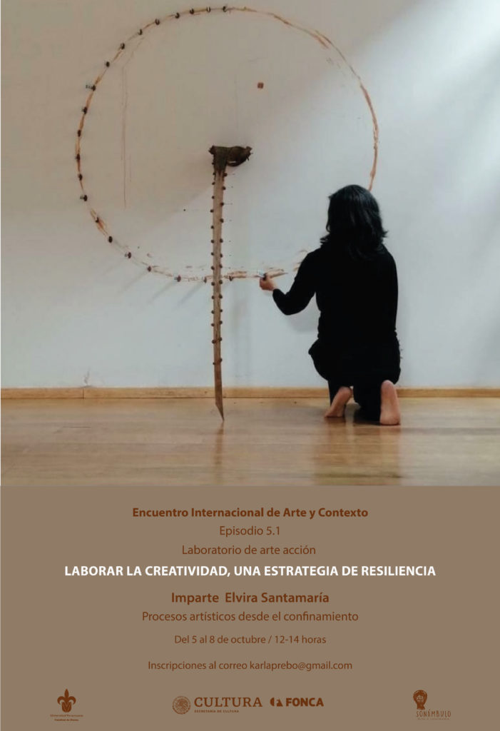 Esta actividad en torno al arte acción y al arte de procesos tiene como eje las investigaciones artísticas de Elvira Santamaría, miembro del Sistema Nacional de Creadores. El objetivo de este laboratorio es vincular a los estudiantes de la FAP con los procesos y las reflexiones de una artista reconocida en el campo del arte acción y será coordinado por el colectivo Sónámbulo conformado por Darío Meléndez, la Mtra. Karla Rebolledo -egresada de la Facultad de Teatro de la UV- y la Mtra. Rebeca Torres Orozco.