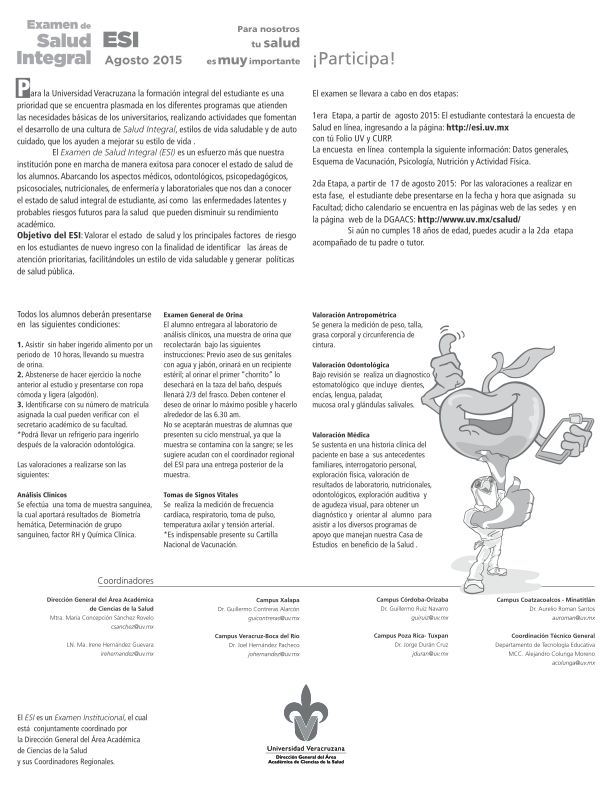 De inicio, el Examen de Salud Integral (ESI) es un esfuerzo más que nuestra institución pone en marcha de manera exitosa para conocer el estado de salud de los alumnos de nuevo ingreso. El ESI abarca de manera general aspectos médicos, odontológicos, psicopedagógicos, psicosociales, nutricionales, de laboratorio y enfermería que nos darán a conocer el estado de salud integral del estudiante así como enfermedades latentes y probables riesgos futuros para la salud que puedan mermar su rendimiento académico.