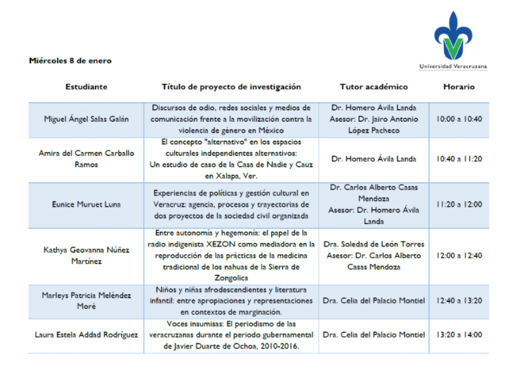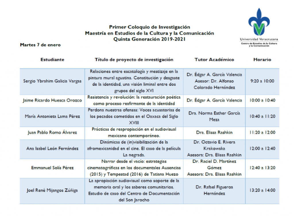 El pasado 7 y 8 de enero de 2019 se realizó el I Coloquio de Investigación de la Quinta Generación 2019-2021 de la Maestría en Estudios de la Cultura y la Comunicación con la presentación de los protocolos de investigación de cada uno de los alumnos de la MECC.
