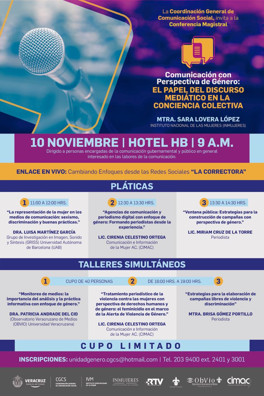 Con el taller, «Monitoreo de medios: la importancia del análisis y la práctica informativa con enfoque de género», el Observatorio Veracruzano de medios participará en este evento el viernes 10 de noviembre. Extendemos la invitación a todos aquellos interesados en el tema.