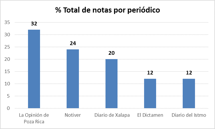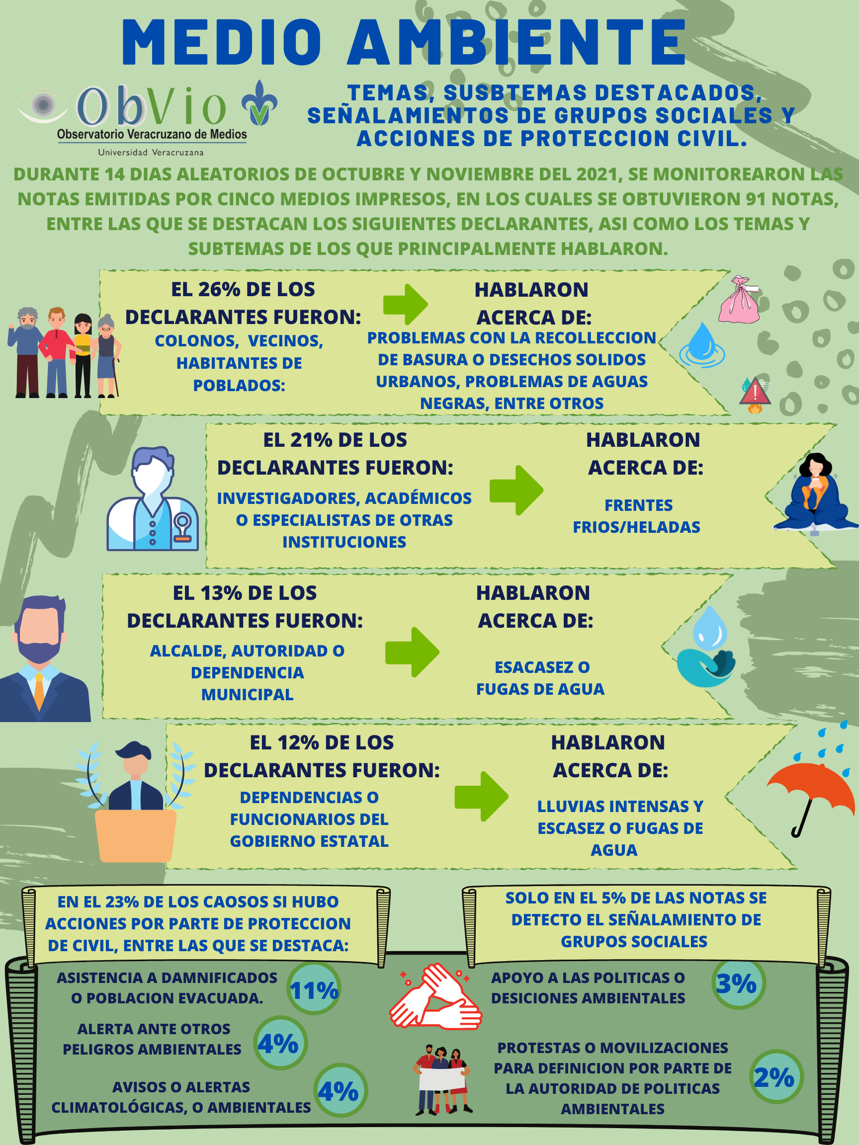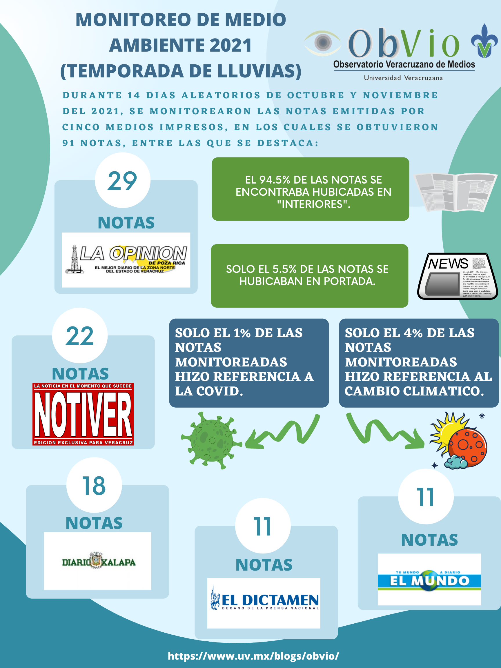 Se encontraron 91 noticias con el referente Medioambiental en los periódicos impresos: La Opinión de Poza Rica, Diario de Xalapa, El Dictamen, Notiver y Mundo de Orizaba, durante 14 días aleatorios de los meses de octubre y noviembre del 2021.