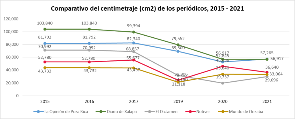 Los resultados arrojan que a partir de la temporada de lluvias del 2017 hubo una disminución en el centimetraje del total de los medios impresos analizados, observando también que disminuyó el tamaño de cada uno.