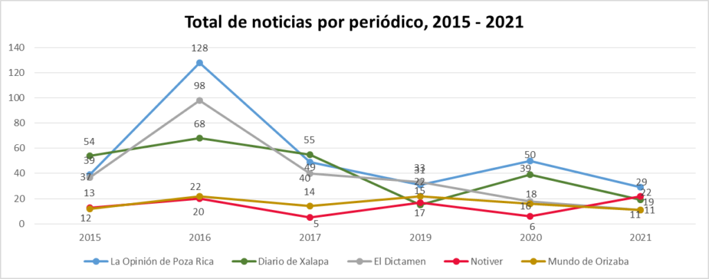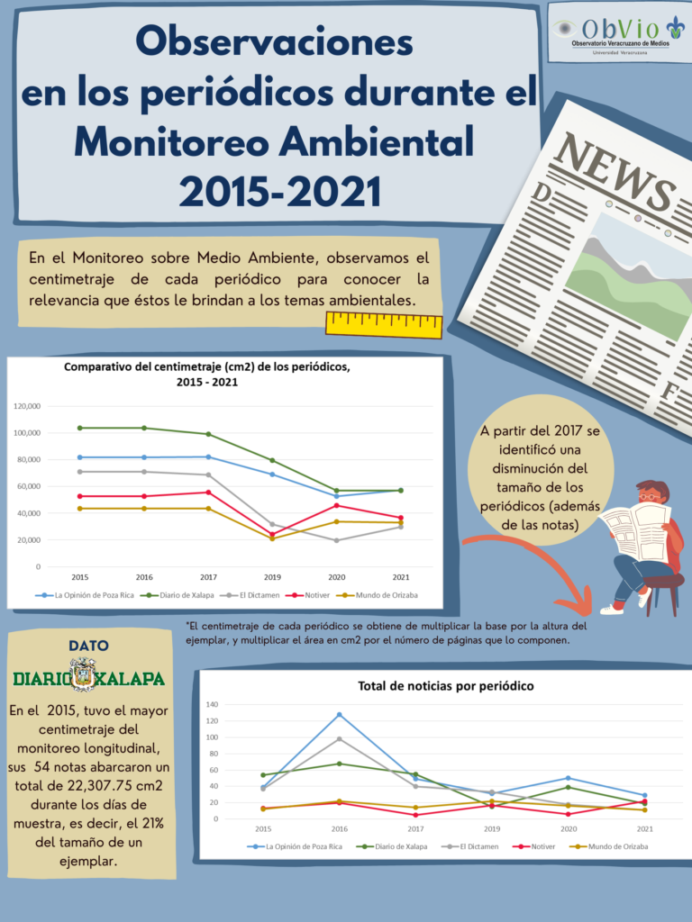 Desde el año 2012 el Observatorio Veracruzano de Medios ha llevado a cabo el monitoreo de prensa impresa veracruzana sobre temas y problemas ambientales en los siguientes diarios: La Opinión de Poza Rica, Diario de Xalapa,El Dictamen, Notiver, y Mundo de Orizaba.