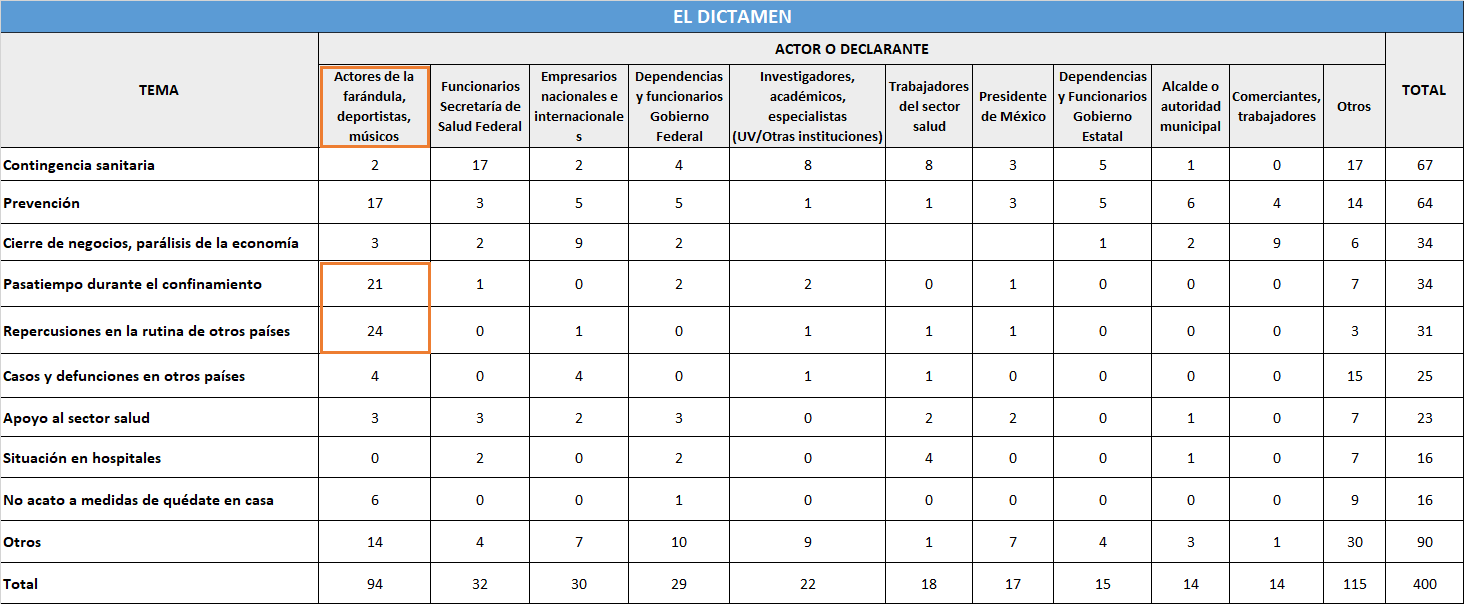 Los temas de “Repercusiones por la pandemia en la rutina de otros países” y “Pasatiempo durante el confinamiento” fueron emitidos en 45 noticias de 400 por parte de los “Actores de la farándula, deportistas, músicos” en El Dictamen.