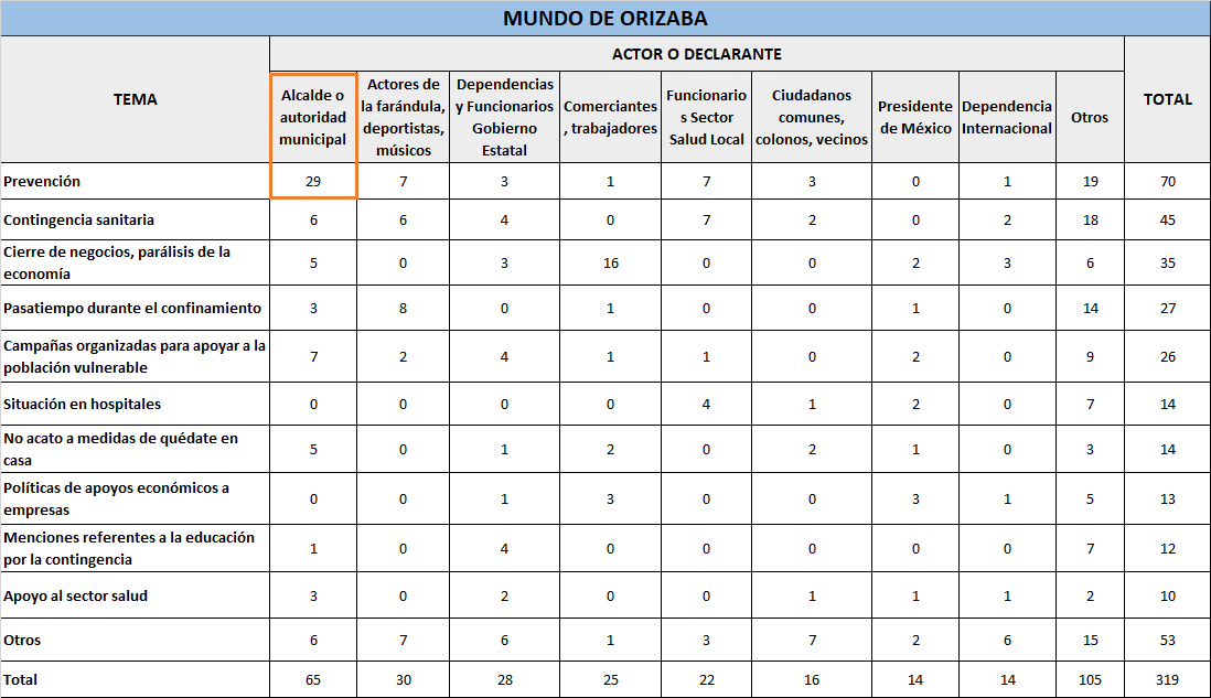 En el Mundo de Orizaba, el tema de la “Prevención” se abordó en 29 de 319 noticias por los “Alcaldes o autoridad municipal”.
