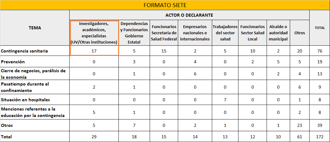 Los “Investigadores, académicos, especialistas en el tema” de la UV y otras instituciones, emitieron información en 17 noticias sobre la “Contingencia sanitaria” dentro del portal Formato Siete.