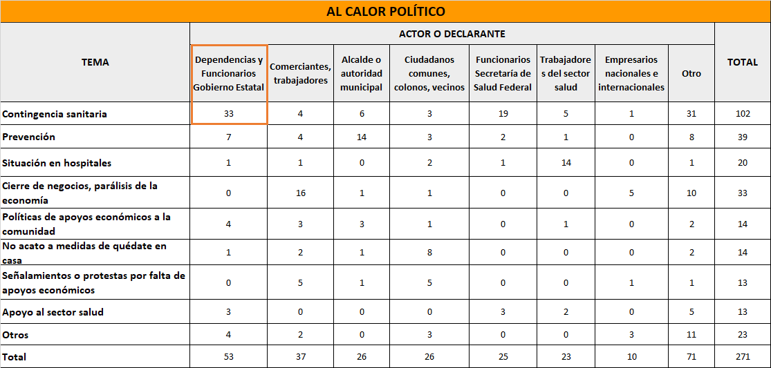 En Al Calor Político, en 33 de 271 noticias emitidas, la “Contingencia sanitaria” fue abordada por las “Dependencias y funcionarios del Gobierno Estatal”.
