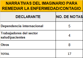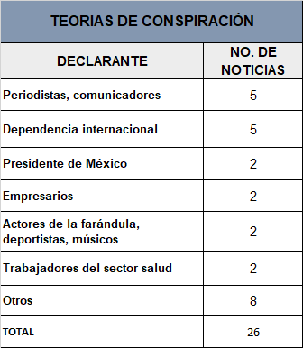 El rasgo del discurso de las Teorías de conspiración (cuando alude que el virus y sus consecuencias son actos de conspiración)  fue abordado por los periodistas/comunicadores y Dependencias internacionales, éste último declarante emitió la mayoría de las noticias con el rasgo de Narrativas del imaginario para remediar la enfermedad/contagios (referido a solucionar los contagios o la enfermedad no precisamente por el ámbito médico/científico).