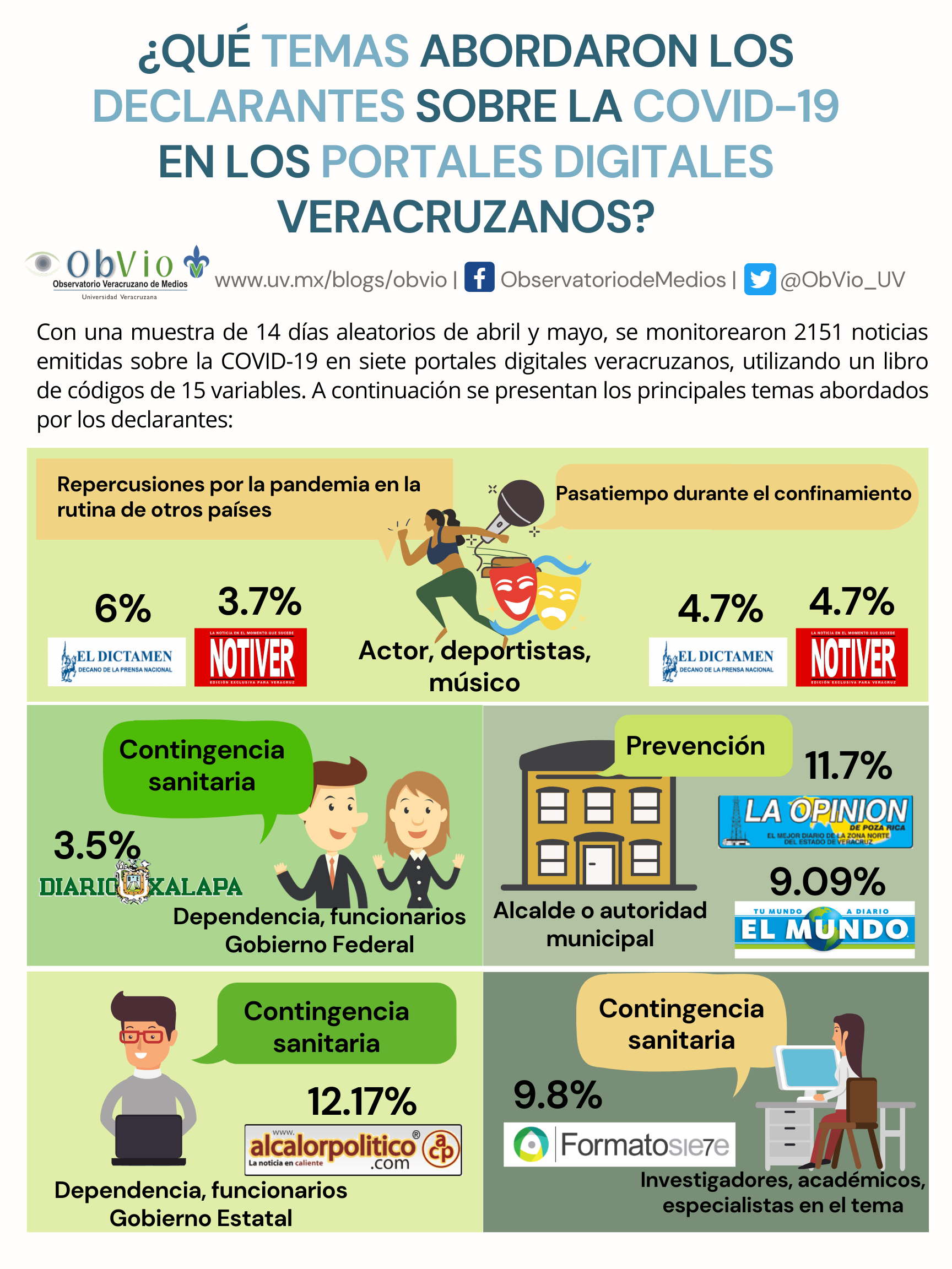 El Monitoreo realizado por el Observatorio Veracruzano de Medios en siete portales digitales: La Opinión de Poza Rica, Diario de Xalapa, El Dictamen, Notiver, Mundo de Orizaba, Formato Siete y Al Calor Político, durante 14 días aleatorios de los meses de abril y mayo del 2020, resultó en 2151 noticias sobre el tema COVID-19.