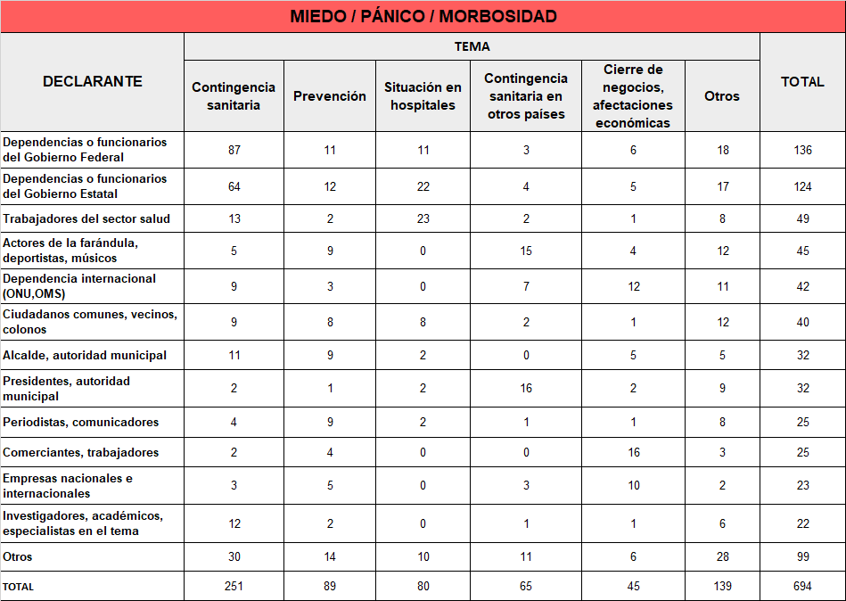 El rasgo de Miedo/pánico/morbosidad, referido a las noticias que narren acontecimiento que generen morbo, predominó en las notas sobre Contingencia sanitaria (251), principalmente emitidas por los Dependencias o funcionarios del Gobierno Federal.