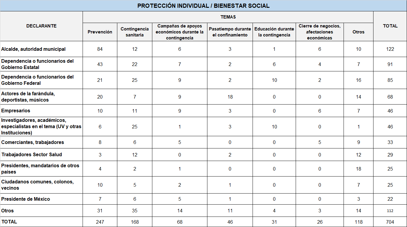 Para la presentación de resultados, se unieron los rasgos de Protección individual (que describe los actos de prevención como actos de cada individuo) y Bienestar social (alude a la protección para cuidar a los demás), los cuales se abordaron en 247 noticias con el tema de Prevención,  emitidas mayormente por los Alcaldes o autoridades municipales (84).