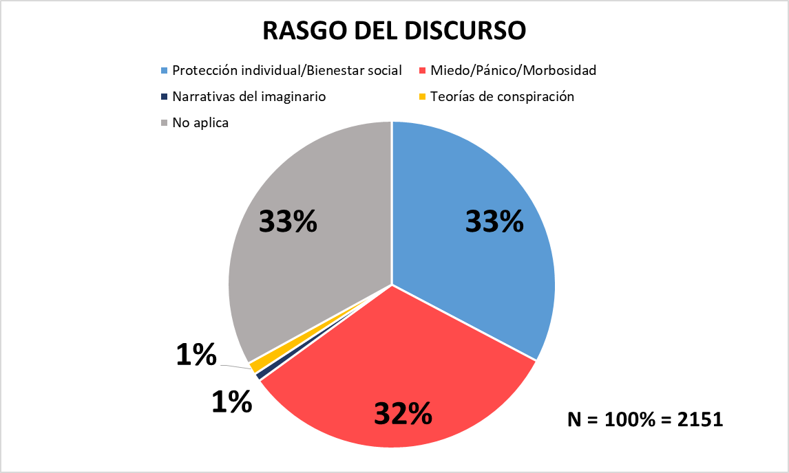 De las 2151 noticias, el 33% utilizó el rasgo del discurso: “Protección individual/Bienestar social”, y el 32% de “Miedo/pánico/morbosidad”.