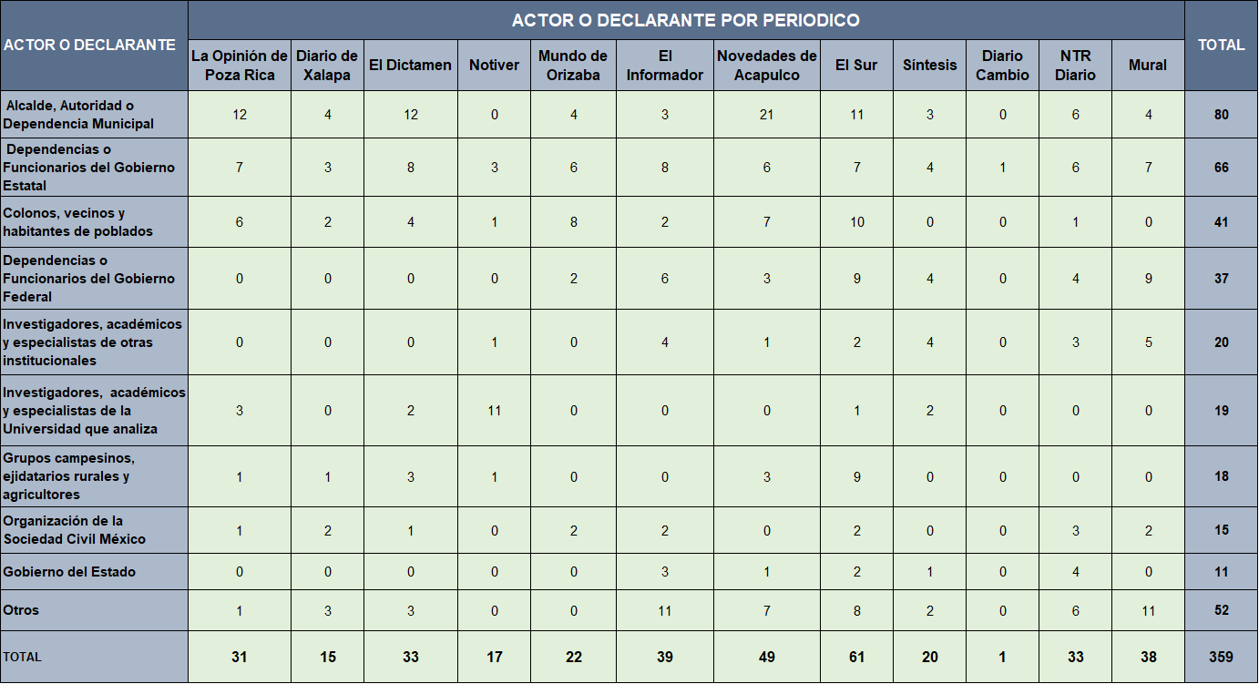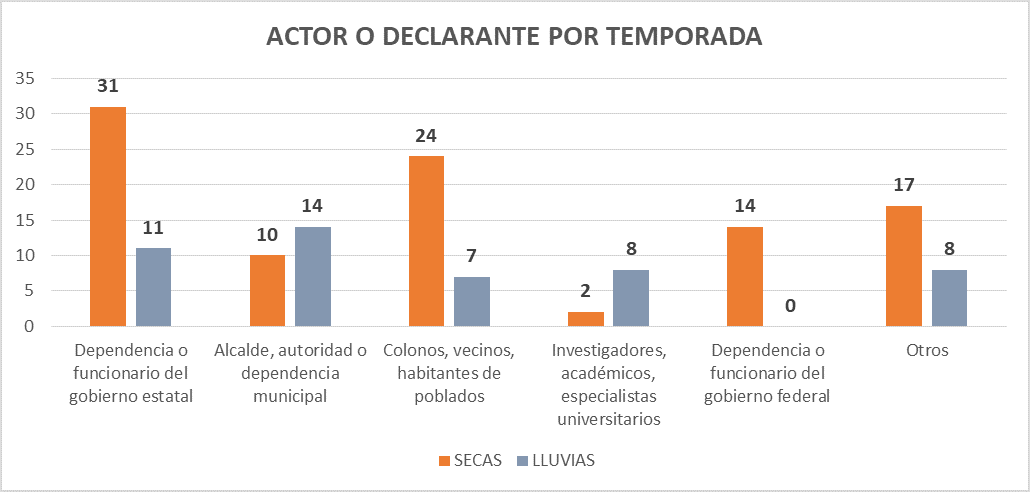 Respecto a los Actores o Declarantes, las Dependencias o funcionarios del gobierno estatal son los progonistas de las notcias ( 31.6%) en la temporada de Secas. Mientras que los municipios a través de sus alcaldes o autoridades emitieron el 29% de las noticias durante la temporada de Lluvias.