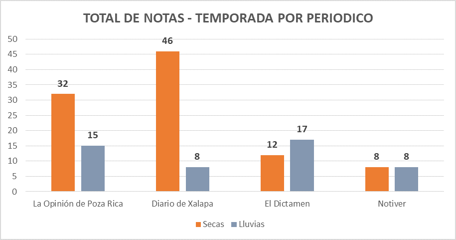 En la temporada de Secas, se obtuvieron 98 notas analizadas. El periódico con más notas sobre temas de medio ambiente fue el Diario de Xalapa (46) seguido de La Opinión de Poza Rica (32).