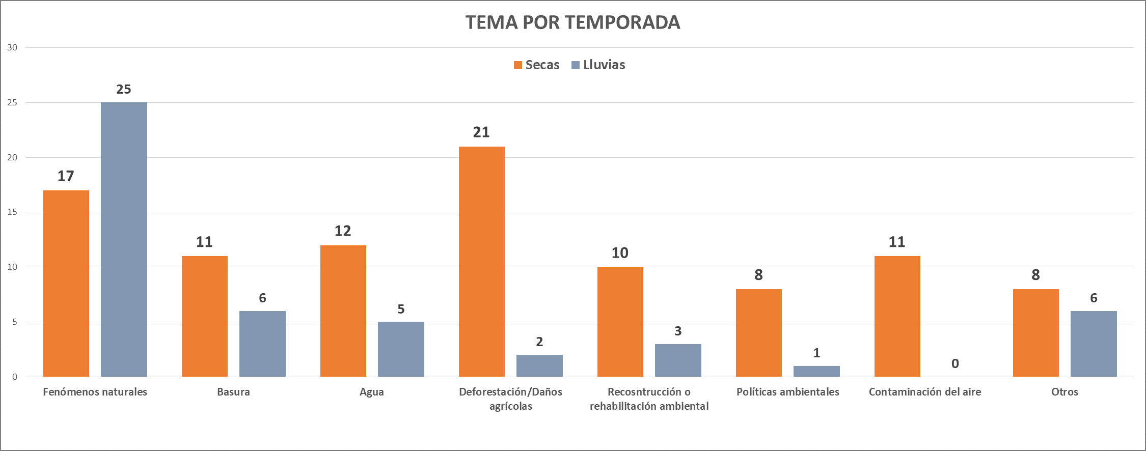 El tema “Fenómenos naturales” ocupó el 50% de las noticias en temporada de Lluvias, mientras que “Deforestación o daños agrícolas” (21%) predominó en la temporada de Secas.
