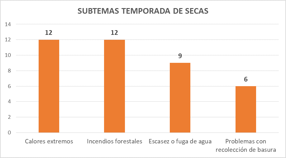 Las principales problemáticas (subtemas) durante la temporada de mayo fueron incendios forestales y los calores extremos (24 notas), seguido de fugas/escases de agua (9) y basura (6).
