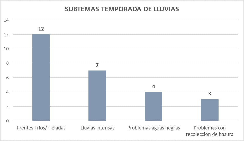 Para la temporada de octubre – noviembre, los Frentes Fríos/Heladas predominaron con 12 noticias, seguido por el subtema de Lluvias intensas (7).