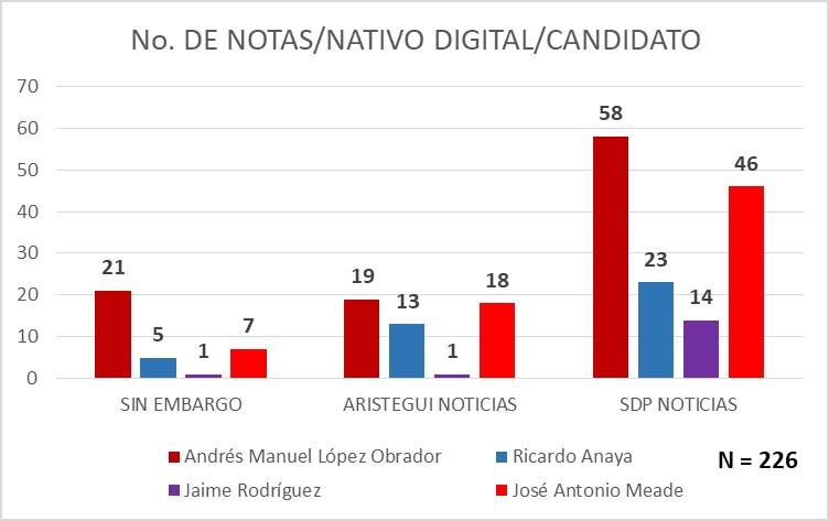 226 notas hablaron sobre “un candidato”, en los tres nativos digitales predominaron las notas sobre Andrés Manuel López Obrador.