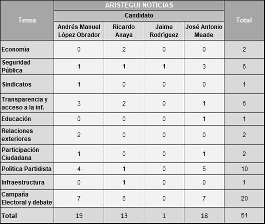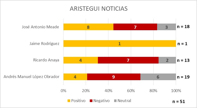 En Aristegui Noticias, la mayoría de notas positivas fueron para José Antonio Meade, mientras que Ricardo Anaya y Andrés Manuel López Obrador tuvieron más notas negativas.