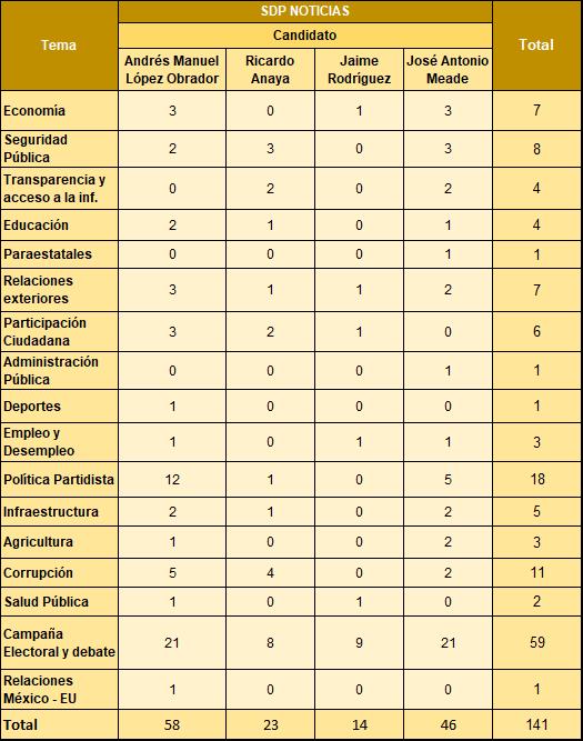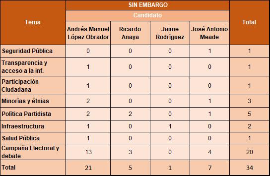 A continuación se presentan los temas de las notas en cada nativo digital por candidato. El  tema más abordado fuer “Campaña electoral y debate”, destacando también “Política partidista” y “Corrupción”.