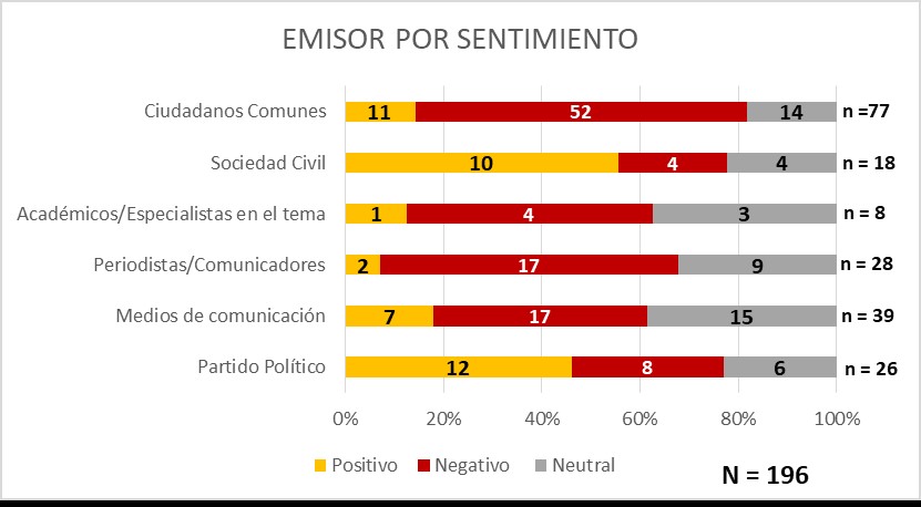 Los usuarios de Twitter que más emitieron tuits sobre los candidatos fueron las cuentas de  “Ciudadanos comunes”, “Medios de Comunicación” y “Periodistas/Comunicadores”. Predominan los negativos en “Ciudadanos comunes”.