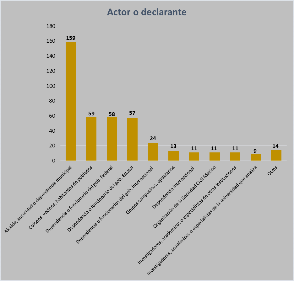 De 426 notas analizadas, el “actor” “Alcalde, autoridad o dependencia municipal” (159 notas) fueron los que protagonizaron las noticias ambientales; le sigue los “Colonos, vecinos habitantes de poblados” (59 notas).