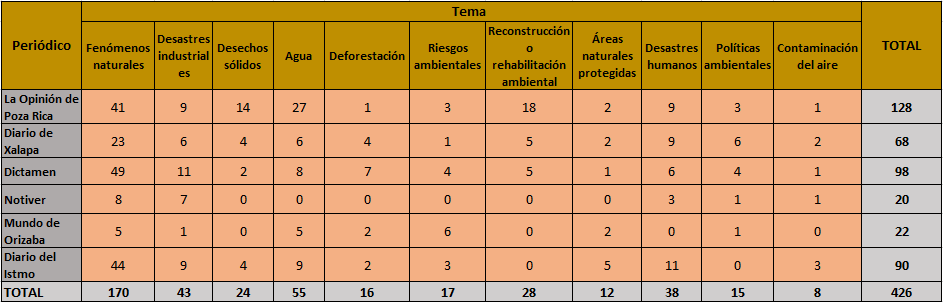 En el monitoreo de temas ambientales, realizado en seis periódicos de la prensa impresa veracruzana, del 1 de septiembre al 30 de noviembre del 2016 se analizaron qué temas y qué actores fueron los que más aparecieron en la prensa. A continuación se presentan estos resultados.