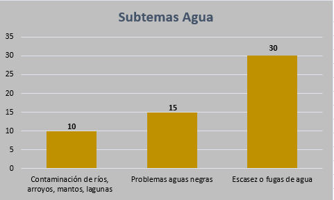 El segundo lugar lo obtuvo el tema del “Agua” que predominó en 55 notas, “Escasez” y “Problemas de aguas negras” son los dos subtemas que más se mencionaron dentro de dicha variable.