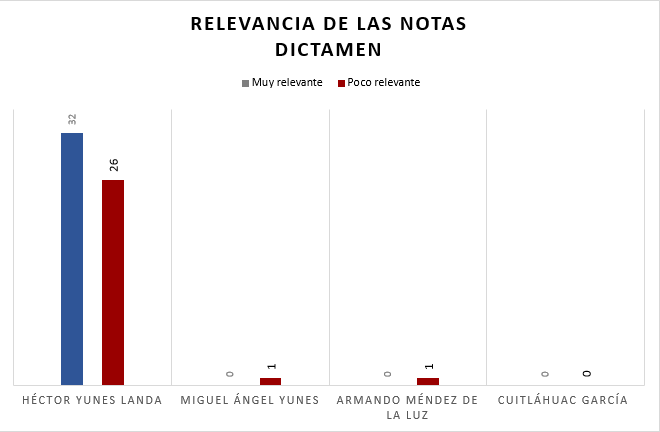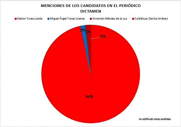 El Dictamen registró 61 notas. La siguiente gráfica muestra las menciones de los candidatos, donde se observa que el 96% de las notas son menciones sobre la campaña de Héctor Yúnes Landa. Cuitláhuac García no obtuvo ninguna mención.
