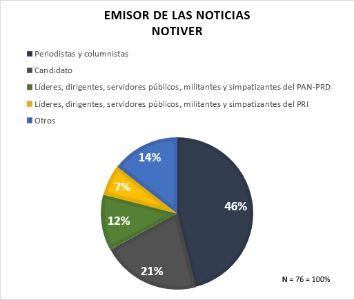 El emisor de la nota es quien emite la información o expresa su opinión acerca de los candidatos, en el periódico El Dictamen los “Periodistas y columnistas” emitieron el  78% de las noticias analizadas.