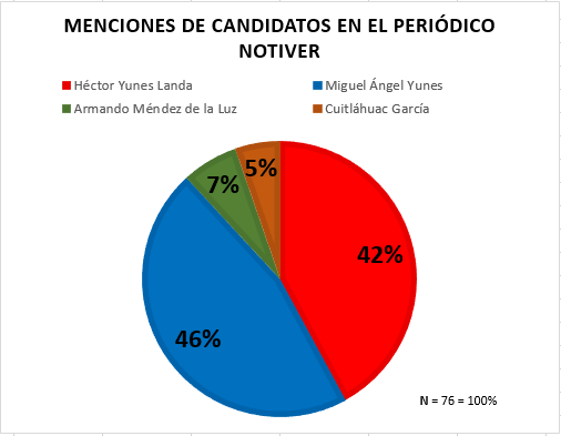 El periódico Notiver emitió  63 notas. El 46% de esas notas mencionaron al candidato Miguel Ángel Yunes Linares, seguido del candidato Héctor Yunes Landa con un 42%, como se muestra en la siguiente gráfica:
