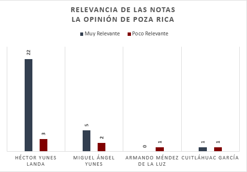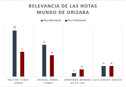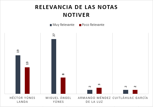 Las noticias en espacios “Muy relevante” son  para el candidato de Héctor Yunes Landa. Las pocas notas registradas para los candidatos de la coalición PAN/PRD y Movimiento Ciudadano se presentaron como “Poco relevantes”.