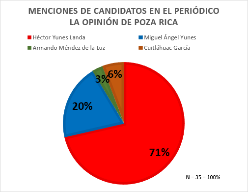 La Opinión de Poza Rica registró 35 notas. La siguiente gráfica muestra las menciones de los candidatos, donde se observa que el 71% de las notas son menciones sobre la campaña de Héctor Yunes Landa.