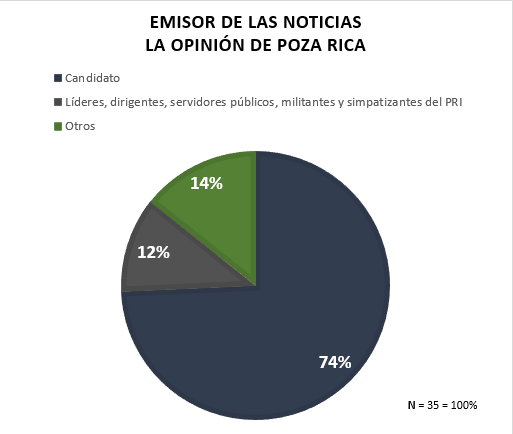 El emisor de la nota es quien emite la información o expresa su opinión acerca de los candidatos, en el periódico La Opinión de Poza Rica los “Periodistas y columnistas” emitieron el  78% de las noticias analizadas.