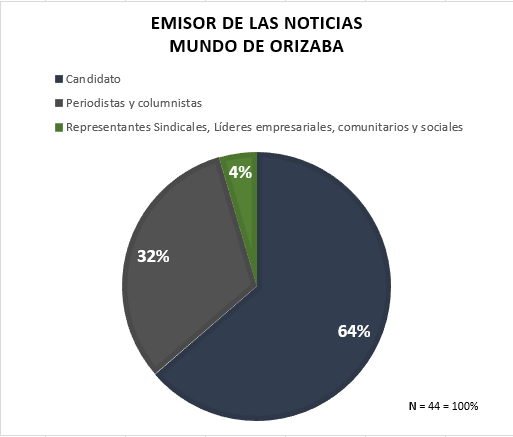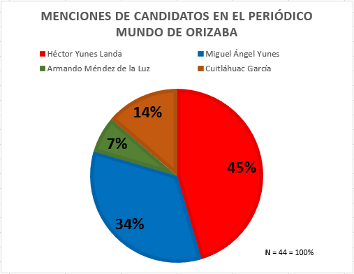 El periódico Mundo de Orizaba emitió  44 notas. El 45% de esas notas mencionaron al candidato Héctor Yunes Landa, seguido del candidato Miguel Ángel Yunes Linares con un 34%, como se muestra en la siguiente gráfica: