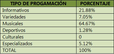 Los resultados muestran que el tipo de Programación musical fue la más emitida y la  que menos, es la de Tipo Cultural, con  cero por ciento.