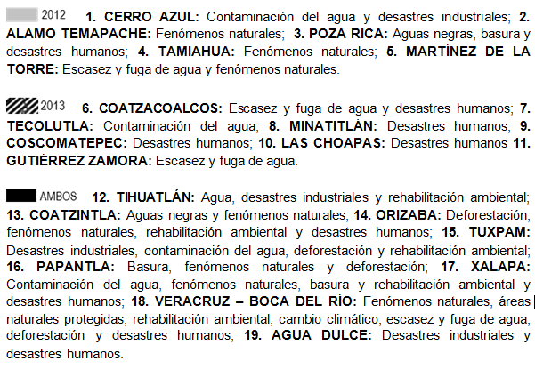 Los municipios que aparecen con muchas noticias acerca de temas ambientales en ambos períodos de análisis son: Coatzintla, Orizaba, Tuxpam, Papantla, Xalapa, Veracruz – Boca del Río y Agua Dulce.