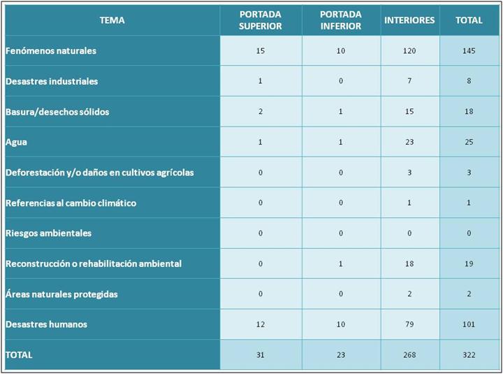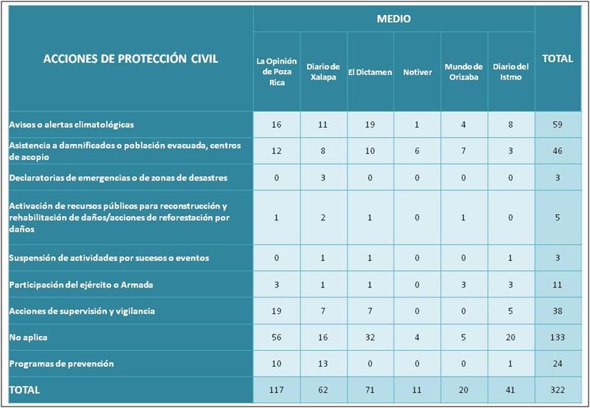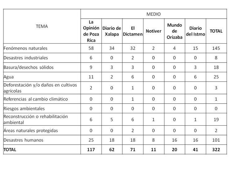 De este modo, los periódicos La Opinión de Poza Rica, Diario de Xalapa, Mundo de Orizaba, Notiver, El Dictamen y Diario del Istmo publicaron en esta primera semana del estudio un total de 322 noticias, de las cuales 145 se refirieron al tema «Fenómenos naturales» y 101 a «Desastres humanos». La Opinión de Poza Rica es el diario que más noticias publicó en este periodo.