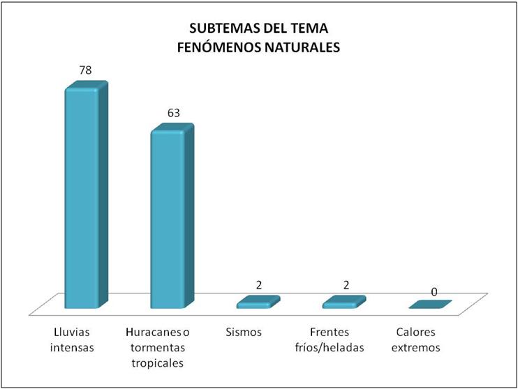 En el tema «Fenómenos naturales» se detectaron varios subtemas siendo los relacionados con «Lluvias intensas y «Huracanes o tormentas tropicales», los más mencionados en las noticias, como se observa en la siguiente gráfica:
