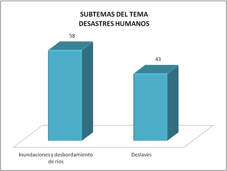El tema «Desastres humanos», incluyó de manera más frecuente los subtemas «Inundaciones y desbordamiento de ríos» y «Deslaves».