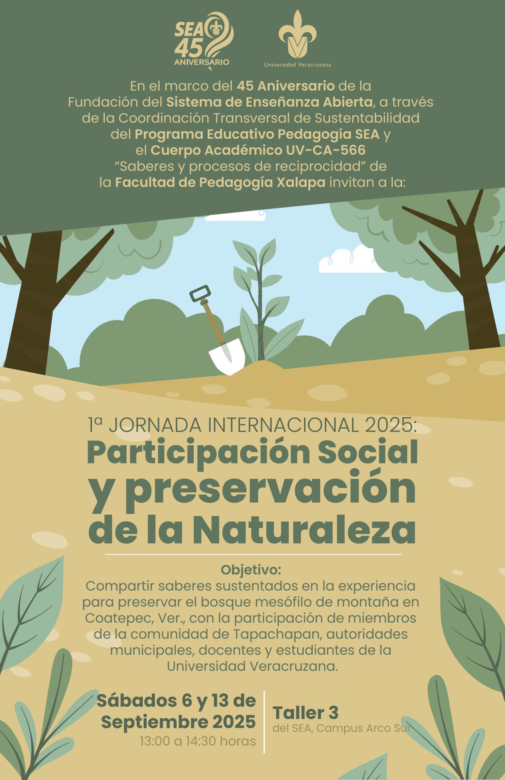 La Universidad Veracruzana,  en el marco del 45 aniversario del Sistema de Enseñanza Abierta, y a través la Coordinación de Sustentabilidad del Programa Educativo de Pedagogía (SEA) y  en colaboración con la Facultad de Pedagogía y el Cuerpo Académico UV-CA-566, invitan a la  1ª Jornada Internacional 2025: “Participación Social y preservación de la Naturaleza”.