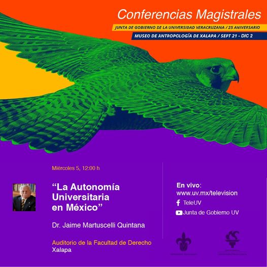 Participa en la #ConferenciaMagistral en el marco del 25° Aniv. de la Junta de Gobierno de la Universidad Veracruzana este 5 de octubre a las 12 h. Escucha lo que el Dr. Jaime Martucelli dice respecto a la independencia política y administrativa de las universidades públicas. Síguelo a través de www.uv.mx/television, https://bit.ly/JuntaDeGobiernoUV y FaceLive TeleUV Secretaría Académica – UV Facultad de Derecho. U.V. Consejería Estudiantil Facultad de Derecho UV 2021-2022 Comunicación UV Vicerrectoría Coatzacoalcos-Minatitlán Vicerrectoría Poza Rica-Tuxpan UV Región Veracruz UV Región Orizaba-Córdoba