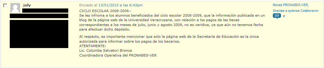 hey que tal, disculpa, pero bueno, no insistire en «cuando se van a pagar los beneficiados del ciclo 2007-2008) porque ni tu lo sabes al parecer, lo que si puedo comentarte es lo siguiente, dices que hablemos con el secretario academico de nuestra facultad, te platico Juan Cesar, que mi secretario academico no tiene ni idea de las fechas, asi como el director y los jefes de carrera de mi facultad, intente comunicarme con la licenciada columba 6 dias seguidos a su extension y jamaaaaaas me contesto y cuando me contestaban, me la negaban, digase «salio a comer», «esta en reunion», etc.. Reamente deberian ser conscientes de la falta que ese recurso hace falta para nosotros los estudiantes de la Universidad Veracruzana, debo un mes de renta y algunas tareas no las he podido llevar como mis profesores me la piden por falta de dinero para imprimir trabajos, debo hacerlos en maquina de escribir mecanica y algunos los entrego mejor en CD por no tener dinero para las impresiones, la señora que me renta el cuarto donde vivo dice que no hay problema, que me espera con la renta, pero diganme, que necesidad tiene esa señora de mantener a alguien que ni de su familia es??? porfavor!!!! hagan algo al respecto, no es justo. habemos personas (Estudiantes) que estamos orando por que ese recurso llegue a nuestras manos, no pido mañana o pasado mañana, pero ya por lo menos antes de que termine el ciclo escolar….que injusticias se estan cometiendo!!!.