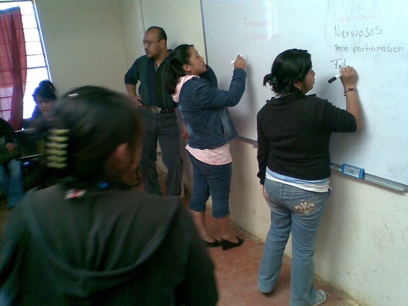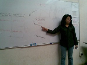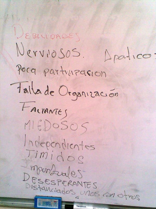 En una hoja en blanco, se pidió a los alumnos que individualmente escribieran en un par de columnas, por separado, sus fortalezas y debilidades. Norma introdujo el ejercicio haciendo una breve descripción de la técnica FODA o DAFO para describir algunas características esenciales que organizaciones y personas comparten en su naturaleza. La explicación fue aderezada con algunos ejemplos: