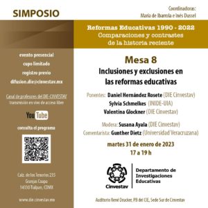 Mesa de trabajo «Inclusiones y exclusiones en las reformas educativas» como parte del simposio Reformas Educativas 1990 – 2022. Departamento de Investigaciones Educativas – Cinvestav. Ciudad de México.